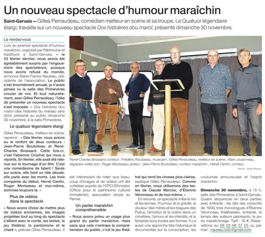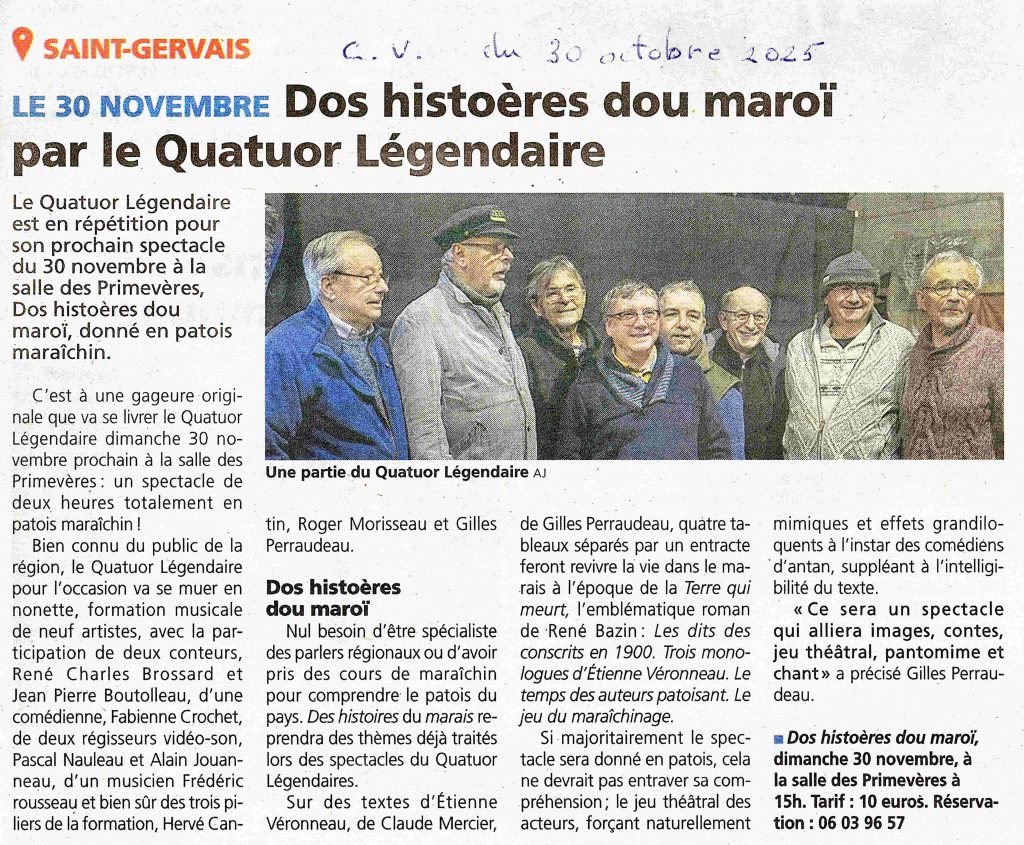 Et deux excellents articles de presse en Vendée sur ce prochain spectacle du 30 novembre 2025 du Quatuor Légendaire et Cie :